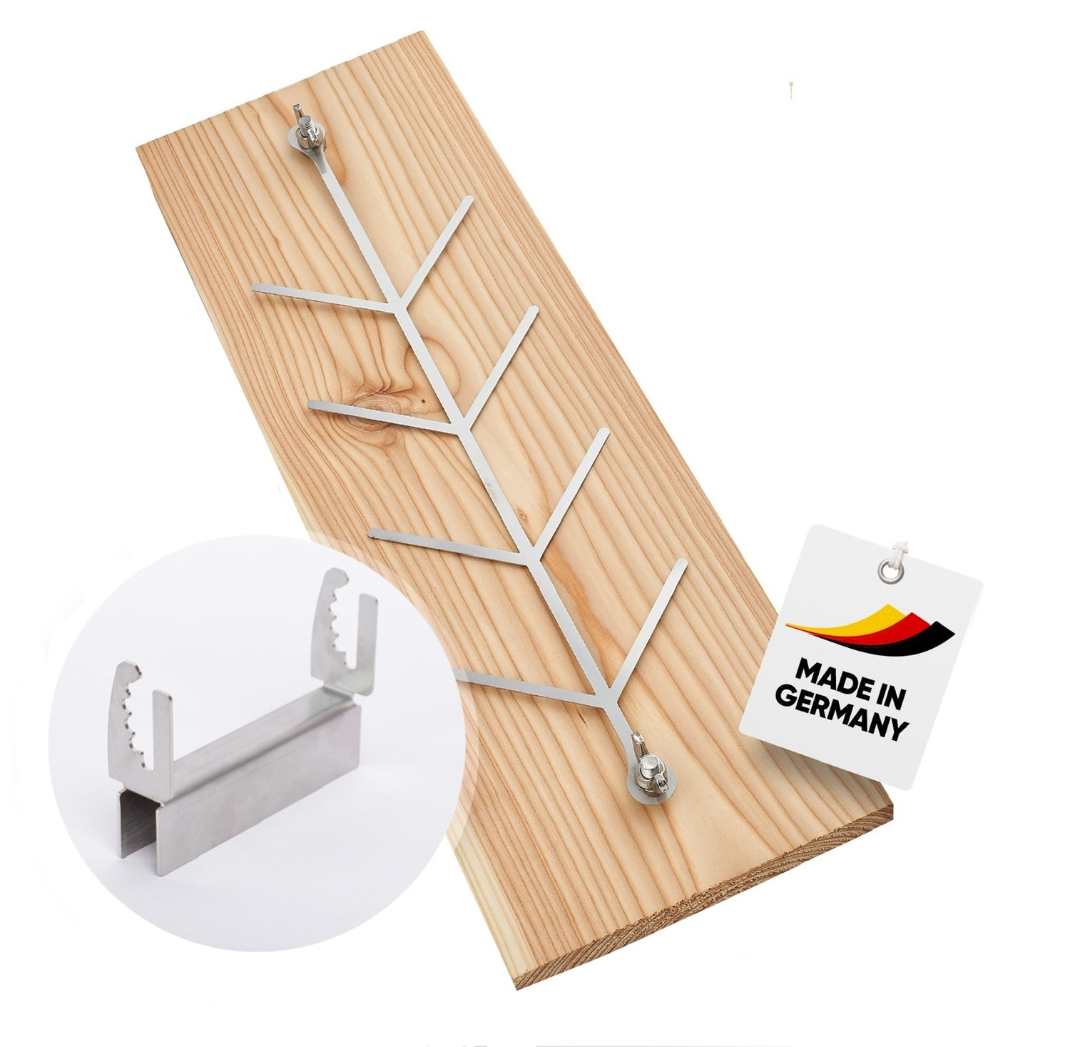 Zu jedem Flammlachsbrett bekommst du eine ausführliche Anleitung mit Bildern und Erklärungen zu jedem Schritt. Die Flammlachsbrettl sind mit einer Edelstahl Gräte zur Fixierung des Filets auf dem Flammlachsbrett ausgestattet. Dies ist praktisch und viel hygienischer als Holznägel. Alle Flammlachsbretter werden mit einer Edelstahl Brettaufnahme ausgeliefert, welsche 5 Winkeleinstellungen ermöglicht. Ich empfehle dir das Brett stets senkrecht zu stellen. Die Flammlachsbretter können mit meiner Brettaufnahme an Feuerschalen, Kugelgrills und mit einem Adapter auch auf der Feuerplatte angewendet werden.