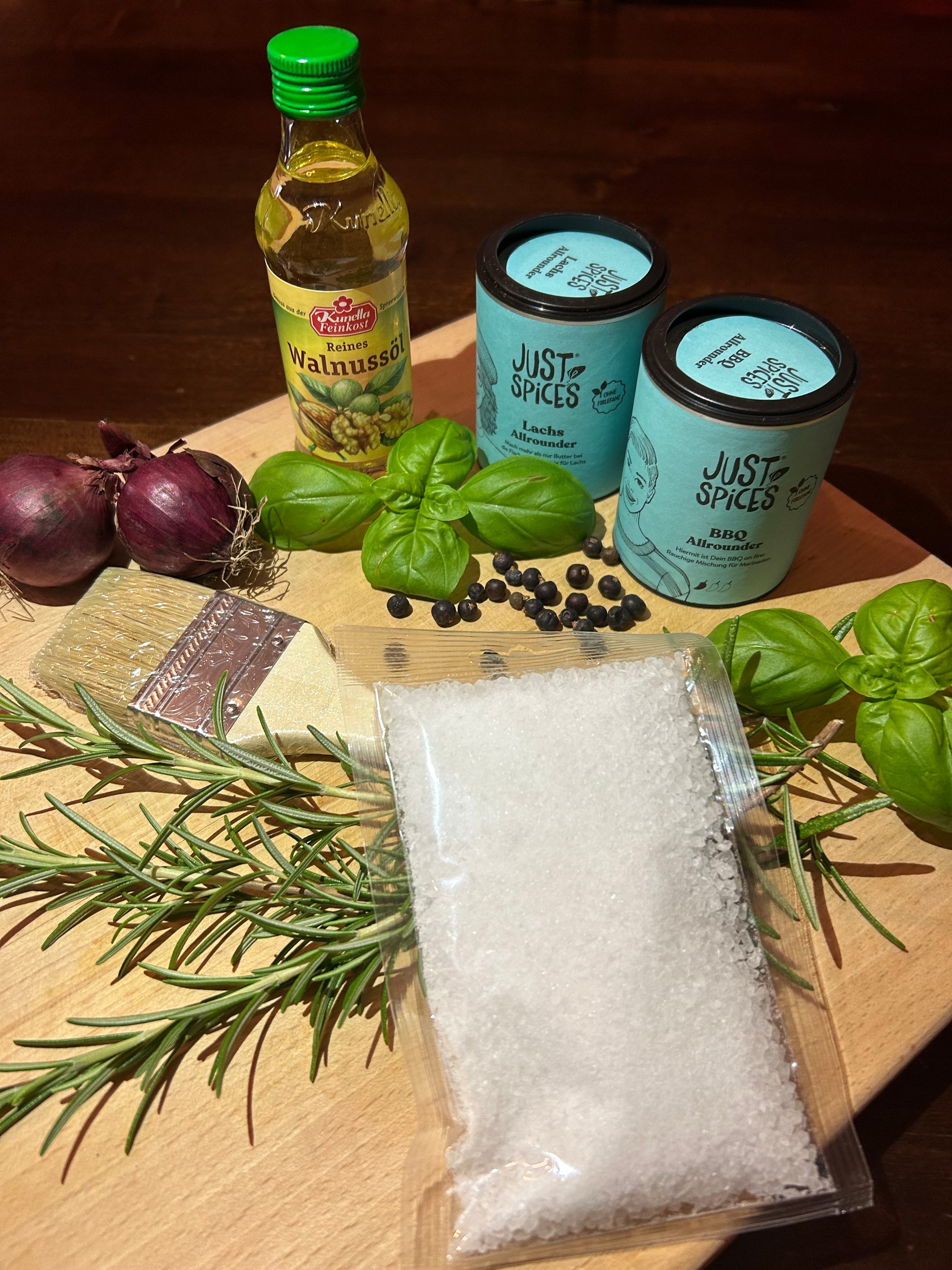 Alles, was Sie für den perfekten Flammlachs benötigen, finden Sie hier, feines Walnussöl, Meersalz und die Lachswürze von Justspice.